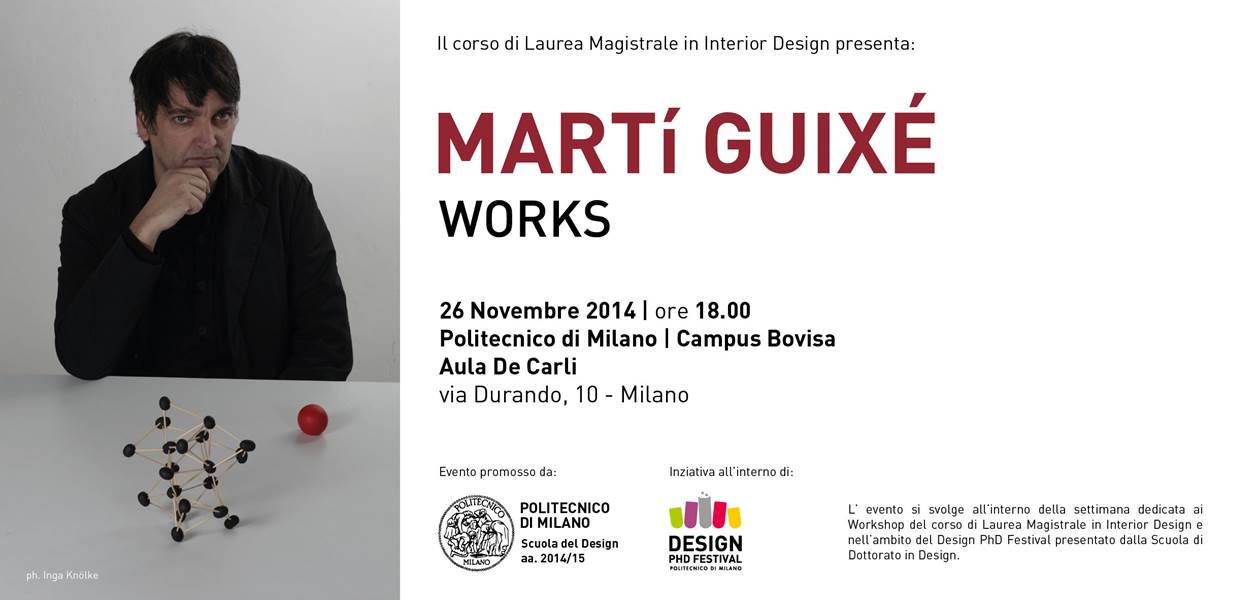 INCONTRO CON Martí Guixé Posted on %e %B %Y by admin Il corso di Laurea Magistrale in Interior Design presenta: MARTÍ GUIXÉ – WORKS 26 novembre 2014 h 18.00 Politecnico di Milano Campus Bovisa Aula de Carli via Durando 10