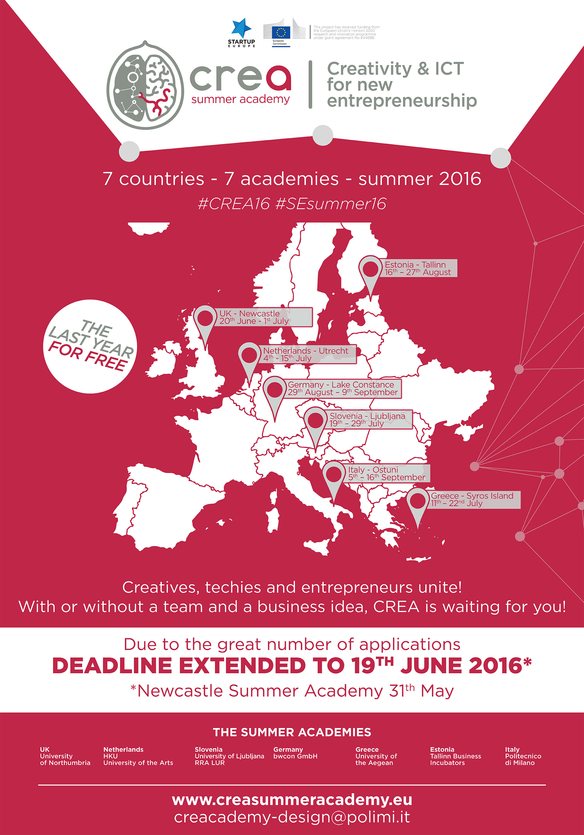 At the CREA Summer Academies and Business Contest, you will be part of a (early stage) start-up team and work on your business idea, combining knowledge and experience from creativity, business theory and technology. Join us in one of the CREA Summer Academy for your first start-up adventure!