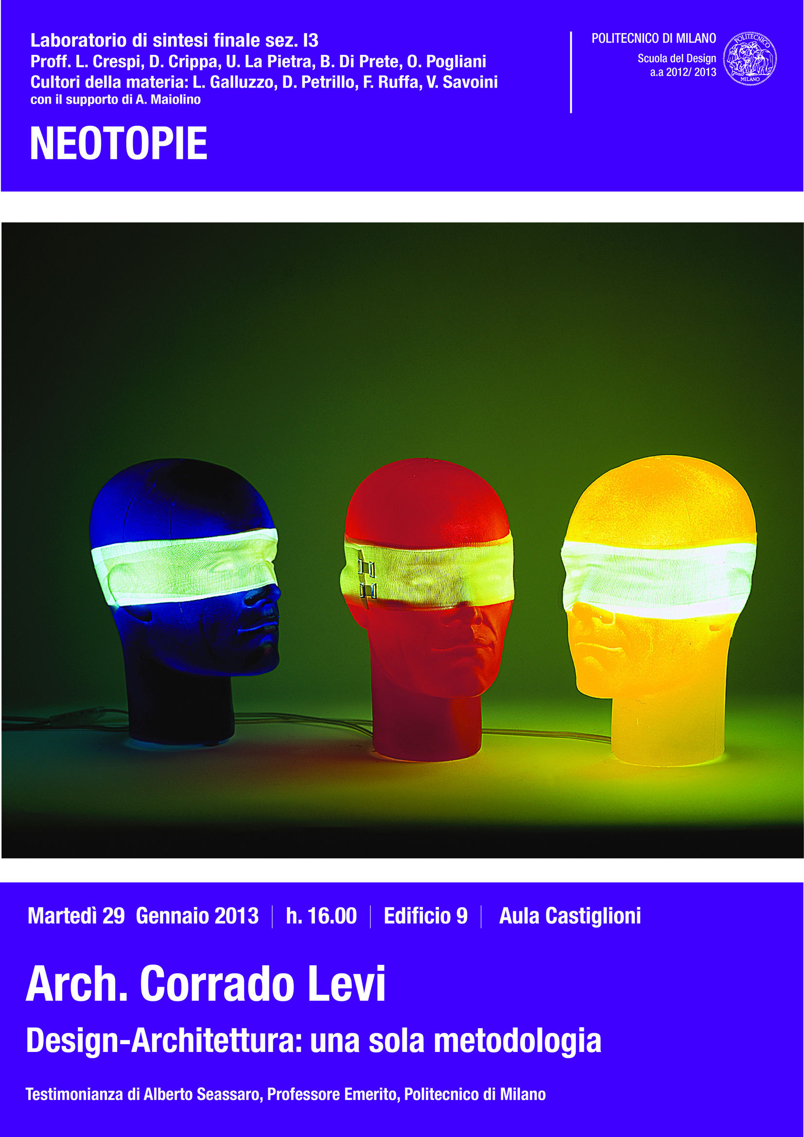 Corrado Levi_ Design-Architettura: una sola metodologia Posted on %e %B %Y by admin Martedì 29 Gennaio – h. 16 Aula Castiglioni, edificio 9 interverrà Alberto Seassaro, Professore Emerito, Politecnico di Milano Corrado Levi Design – Architettura: una sola metodologia