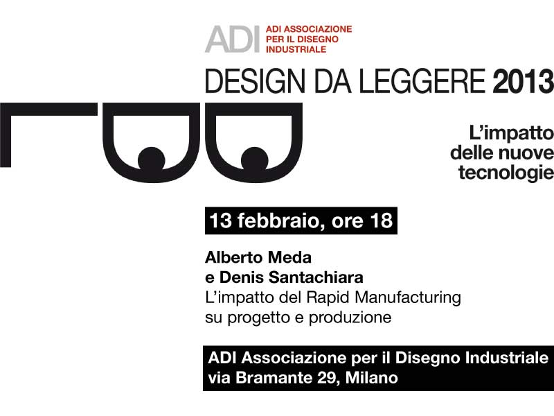 DESIGN DA LEGGERE 2013 Posted on %e %B %Y by admin L’impatto delle nuove tecnologie 13 febbraio, ore 18 Alberto Meda e Denis Santachiara L’impatto del Rapid Manufacturing su progetto e produzione ADI Associazione per il Disegno Industriale via Bramante, 29 – Milano
