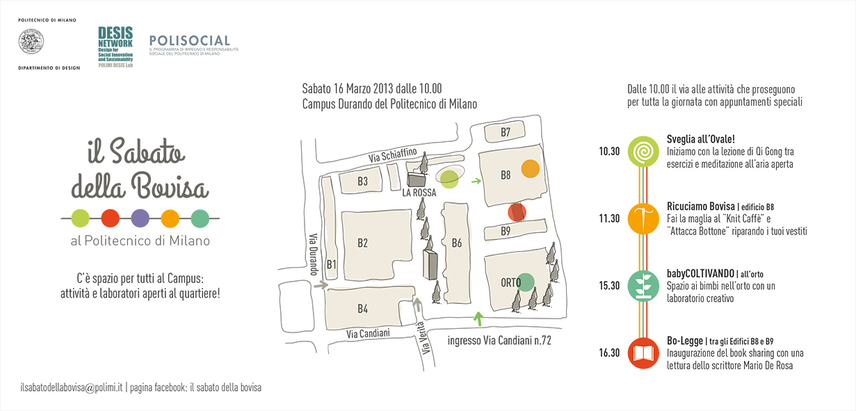 “Il Sabato della Bovisa” è un evento presso il Campus Durando del Politecnico di Milano sviluppato dal POLIMI DESIS LAB del dipartimento di Design e promosso da Polisocial, che apre gli spazi del campus al quartiere Bovisa.