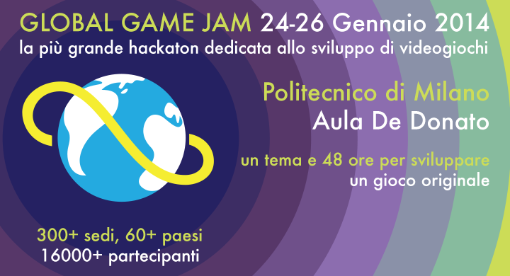 La Global Game Jam è la più grande game jam a livello mondiale con centinaia di location sparse su tutto il pianeta e decine di migliaia di sviluppatori e artisti che lavorano insieme allo sviluppo di videogiochi. Per la prima volta, la Global Game Jam arriva a Milano ed è ospitata nelle aule del Politecnico di Milano. Se siete artisti, grafici, programmatori, musicisti, hobbisti, studenti interessati allo sviluppo di videogiochi, la Global Game Jam è l’evento che non dovete assolutamente perdere. E’ divertente ed è l’occasione per conoscere persone che lavorano o sono semplicemente interessate allo sviluppo di videogiochi.