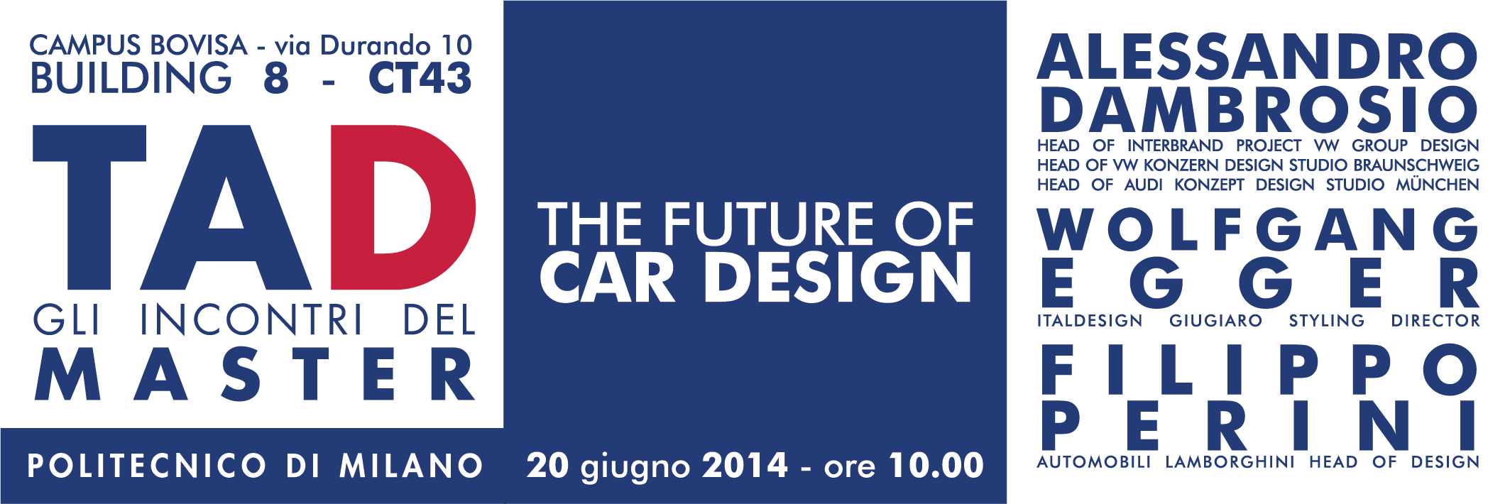 Nella seconda parte della mattinata si procederà alla proclamazione dei diplomati del master e all’inaugurazione della mostra (TAD Master Showcase 2014) con i progetti sviluppati dagli studenti del master per il marchio Audi, allestita nell’atrio dell’edificio B8. La mostra resterà aperta fino al 11 luglio.