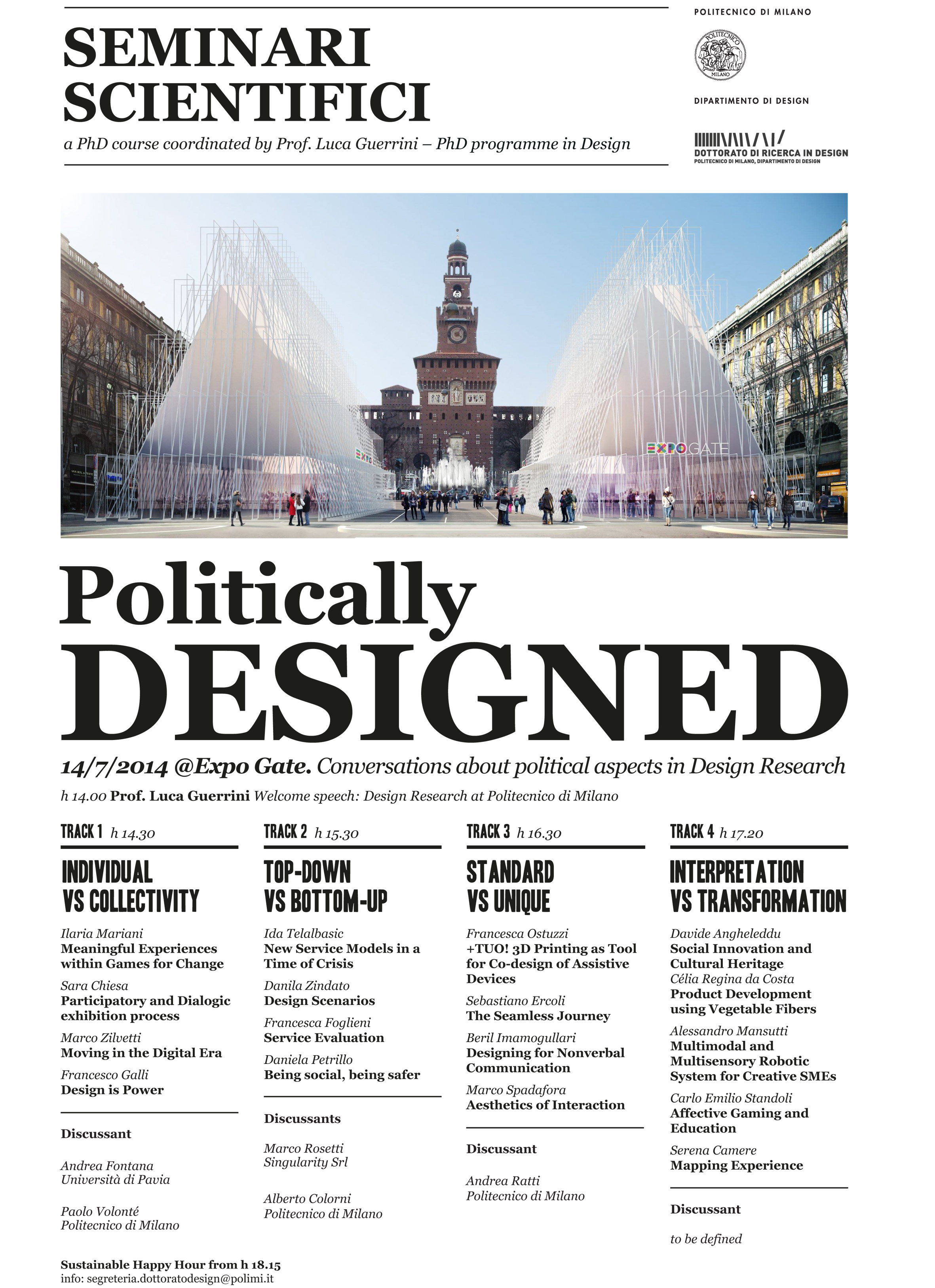 Gli studenti del XXVIII ciclo presenteranno le loro riflessioni sulla dimensione politica della ricerca di design nel contesto sociale, ideologico e strategico. Il tema verrà affrontato e discusso all’interno di quattro tracce, secondo i seguenti approcci:
